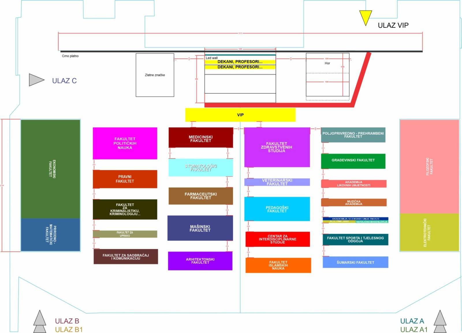 Svi fakulteti i akademije smješteni su u parter i tribinama unutar partera prema crtežu, dok je pratnji predviđeno mjesto na gornjim tribinama. Fakulteti / akademije će dijeliti diplome prema spisku formiranom na osnovu matičnih brojeva i studijskih programa. Studenti i studentice će prilikom zauzimanja mjesta za sjedenje pratiti upute.